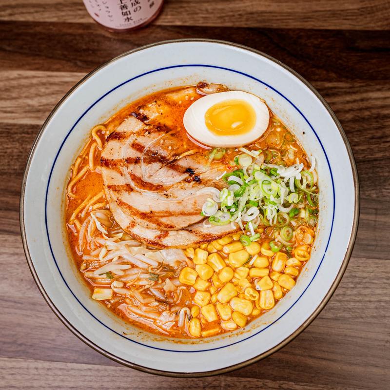 Pork belly, bean sprout, cabbage, green onion, half egg, nori, sweet corn.